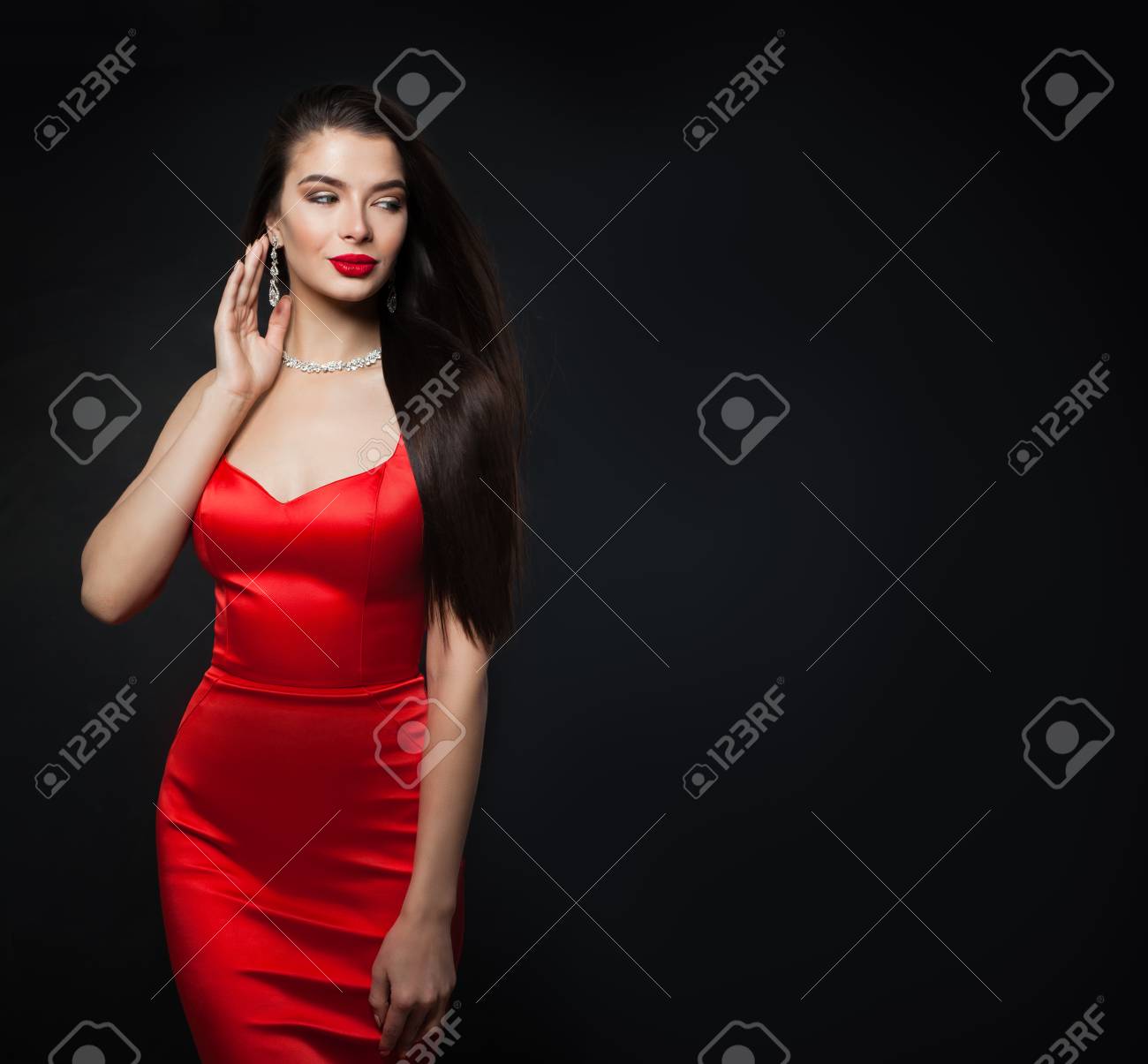 Glamorous Woman Wearing Red Dress Sexy Model With Red Lips Makeup