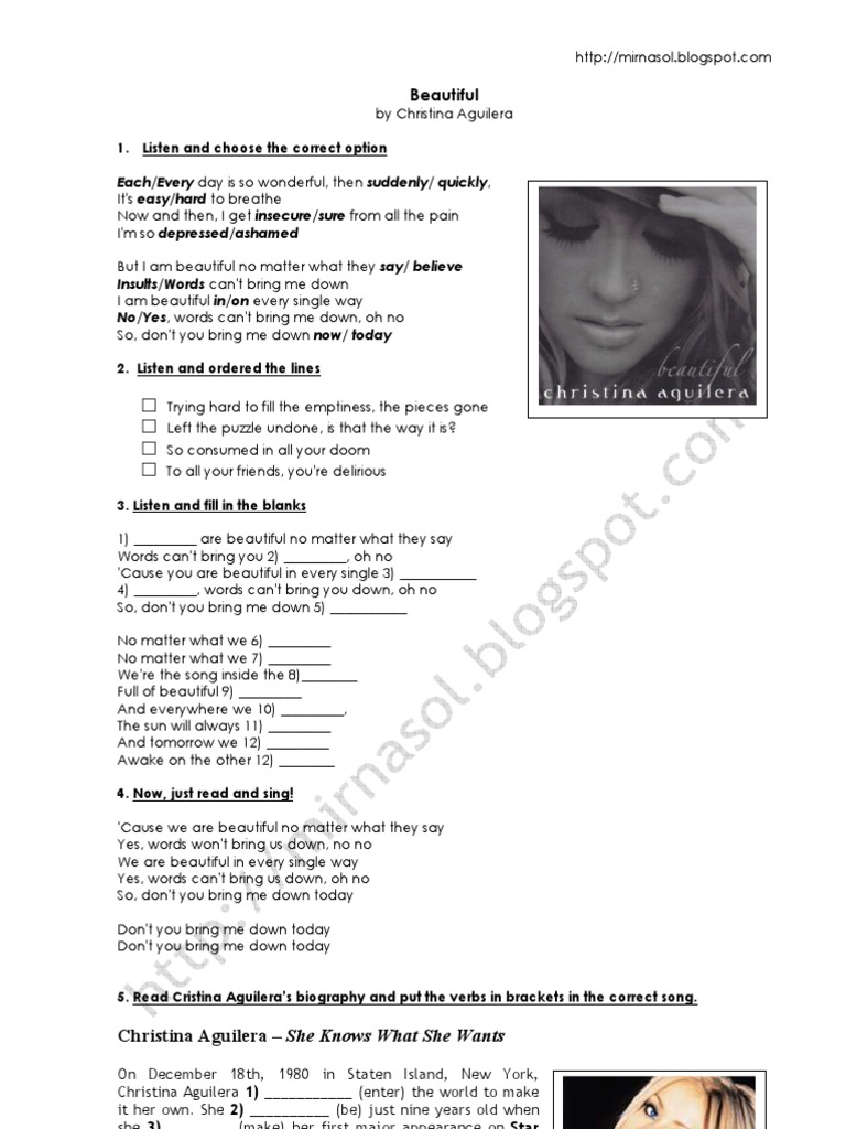 Christina Aguilera Beautiful Esl Worksheet By Petertupe