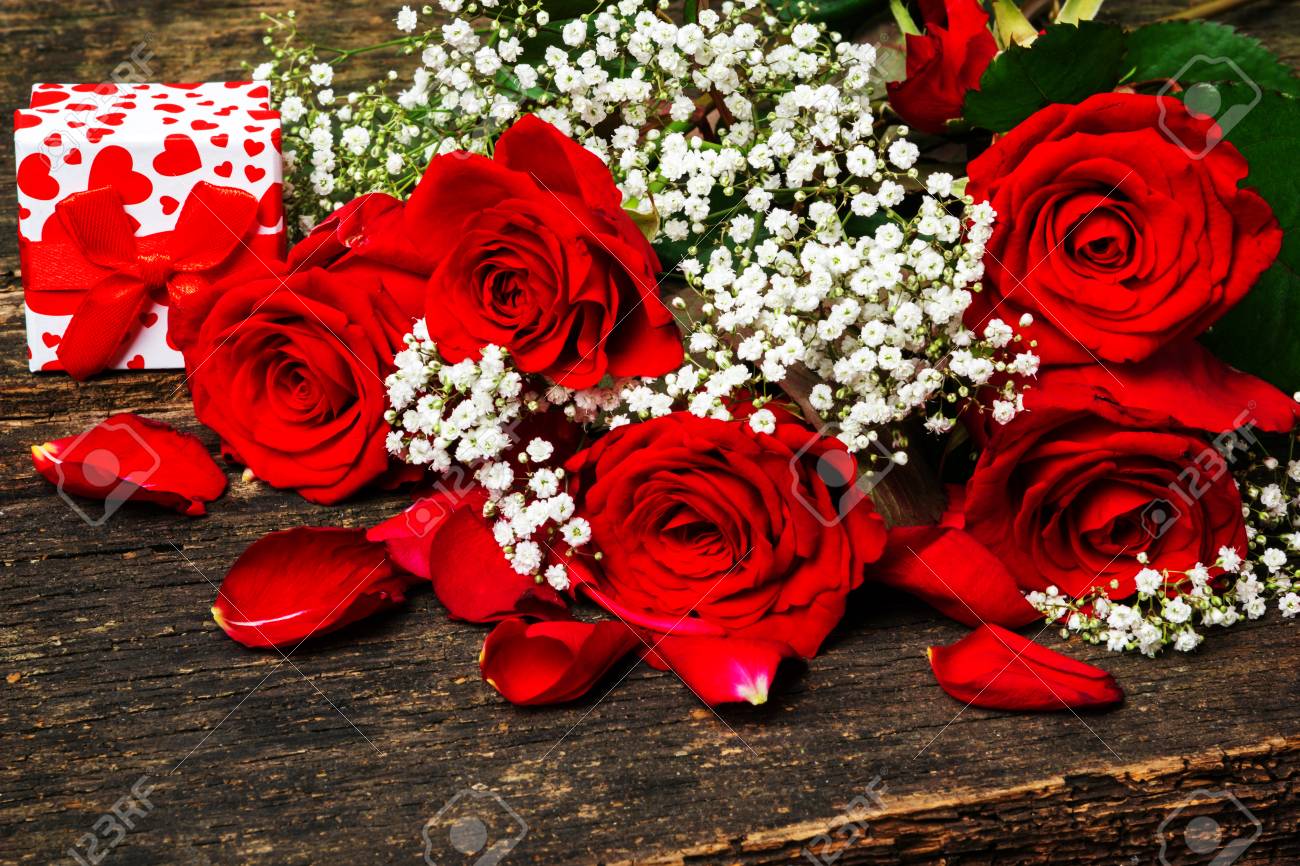Red Roses With Gypsofilia Seeds And A Gift On Wood