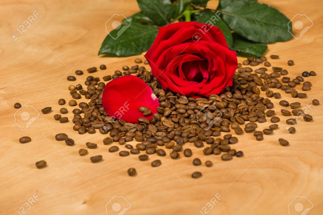 Red Rose On Coffee Seeds And Wooden Background